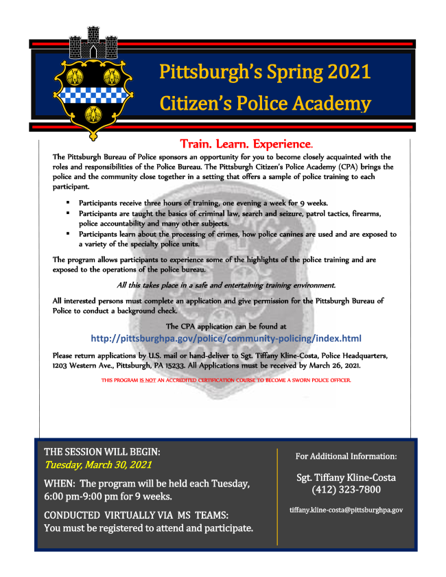 For many years, the Pittsburgh Bureau of Police has sponsored a Citizens Police Academy, an opportunity for citizens in the Pittsburgh community to meet some police officers, get a sample of police training and be exposed to the operations of the Police Bureau. Spring 2021 will be the first time the Citizens Police Academy will be offered virtually.