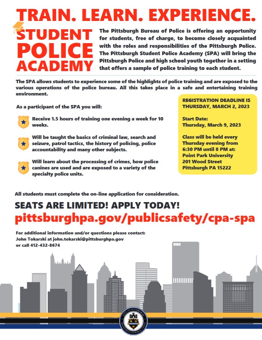 Applications are being accepted for the spring session of the Student Police Academy (SPA) until Thursday, March 2, 2023. The academy is open to all interested high school students in grades 9-12, whether they live inside or outside of the City of Pittsburgh.