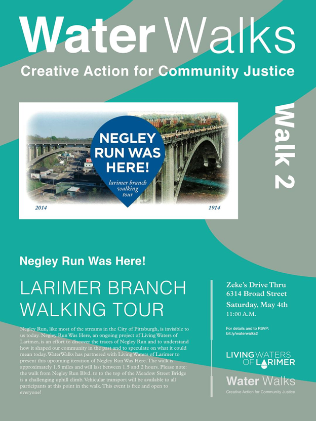 The Negley Run Watershed is the City's largest watershed and includes, among other areas, a small part of eastern Highland Park and Washington Blvd. Like most of the streams in the City of Pittsburgh, Negley Run is invisible to us today. The "Negley Run Was Here" tour is an effort to discover the traces of Negley Run and to understand how it shaped our community in the past and to speculate on what it could mean today. This event is free and open to everyone! Coordinated by WaterWalks with Creative Action for Community Justice, the tour will be on *Sat. May 4 at 11 am*. The walking tour will meet at Zeke's Drive Thru (6314 Broad Street) and last 1.5 to 2 hours. A version of the *Negley Run Was Here* walk was completed in 2015, and you can find a short video recording from it here <https://www.youtube.com/watch?list=PL66CsOUvJ2G5lRXu2jJ85y3eVYp1kecCm&v=pSjgC4zFGew>. Also, if you’re interested in learning more about the location and sites, take a look at this <http://www.a42.livingwaterspgh.org/wp-content/uploads/2015/06/negley-run-tour-pamphlet-final2.pdf> map; printed versions will be available on the day of the walk. Please let the organizers know if you’ll be able to join the walk by visiting the following link: bit.ly/waterwalks2. The Facebook event is here <https://www.facebook.com/events/348349625800981/>. This event is free and open to everyone! A flyer is attached. Please share with your friends, neighbors and colleagues. Stephanie [image: image.png]