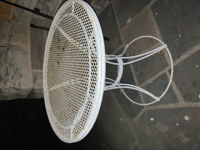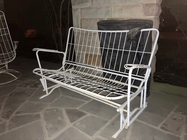For Sale Steel Wire Mid-Century Modern Porch Furniture Please contact Jim at jjreilly@prodigy.net Wire Rocker is in good condition structurally, needs a bit of sandpaper and paint. Measures approximately 42” H X 29” X 29.” No pads available. $50 separately Wire Glider seats two comfortably. Structurally sound, needs a coat of paint. Measures approximately 64”W X 27”D X 33.”H No pads available. $75 separately. Circular wire table for 4. Also needs some paint. Measures approximately 27” high X 30” table diameter. Circular base. $45 separately. All three pieces for $150 or best offer