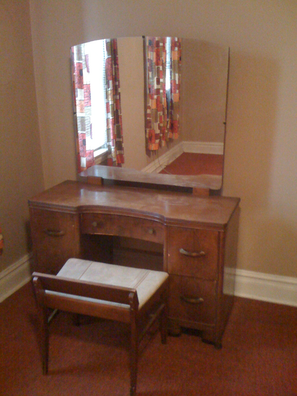 I have an antique vanity dresser dating back to the 40's. There is some normal wear in the finish but the piece was built quite well and all moving parts work smoothly. I am asking $60 but the price is negotiable. Call me at 412 818 4488 if interested. Thanks, Osei