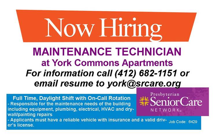 Good afternoon, I am hoping I can the word out that we are looking for Maintenance Tech's within our company owned by Presbyterian SeniorCare. We would also be interested in listing our apartment complex which is an affordable housing apartment complex for seniors 62 years of age and older or 18 years of age with a disability. If you are able to help us out at all please let me know. Thank you for any assistance and I look forward to talking with you. [cid:image001.jpg@01D4D4F9.A6B12740] Thank you, Darlene Kuster Community Manager / Corporate Trainer SeniorCare Network York Commons 4003 Penn Avenue Pittsburgh, PA 15224 T 412.682.1151 | F 412.682.1253 | C 412.965.0353 dkuster@srcare.org<mailto:dkuster@srcare.org> www.SrCareNetwork.org<http://www.SrCareNetwork.org> ************************************************************************************************************************************************************************************ Presbyterian SeniorCare is proud to be the first accredited Aging Services Network in Pennsylvania. This email contains privileged and confidential information intended only for the use of the above-named recipient. If you are not the intended recipient of this email, you are hereby notified that any dissemination or copying of this email strictly is prohibited. If you have received this email in error, please immediately notify the sender by responding to the sender through email and delete the email message. This information has been disclosed to you whose confidentiality is protected by state and federal law. Any further disclosure of this information without prior consent of the person to whom it pertains may be prohibited.