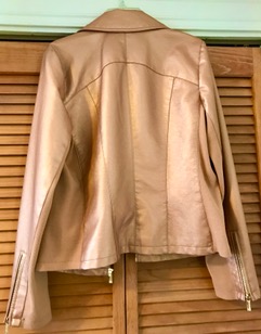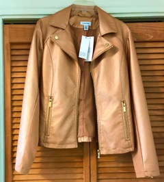 New with tags. Color is brighter and more golden in real life. Leather-looking polyurethane shell with knit insets on sides and sleeves. Lots of gold zippers including on sleeves. Large size. App 16-3/4” from seam to seam across shoulders. App. 24” long. Sleeves app 25” long. Original price $129.50. Selling for $60. janet jai