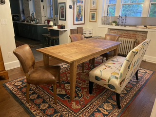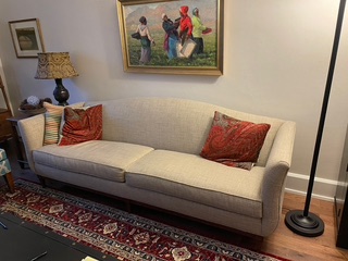 Moving, must sell. Ethan Allen couch. 94” long x 33 deep x 30 high. Excellent condition; no stains or visible wear. New $3000. Asking $400. Restoration Hardware dining table with hidden extension leaf. 72” without leaf; 96” with leaf x 36” wide. Very good condition. Made from recycled wood so has expected irregularities. New $1800. Asking $300 4 nRestoration Hardware dining chairs; leather seats and backs; deliberately distressed leather finish. Very good condition. One chair has minor spot on the seat. New $500/each. Asking $275 for all four. DOES NOT INCLUDE BENCH.