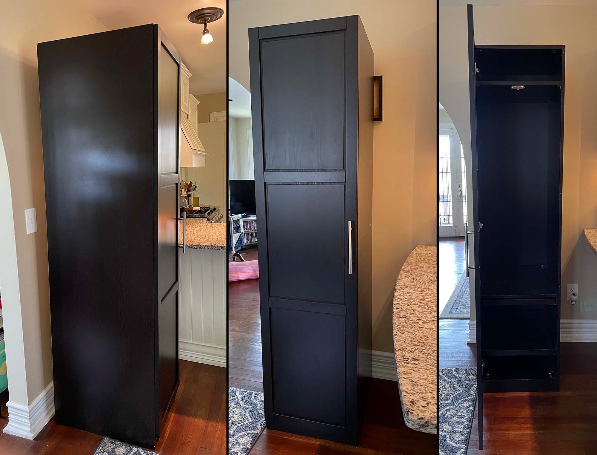 Deep wardrobe with 2 rigid shelves & two sliding shelves. Black brown color. Light wear & tear. Going out to the curb this evening for collection in the morning. North Euclid Ave across from the basketball court. Dimensions: 24" deep 19.5 " wide 78.5 " tall