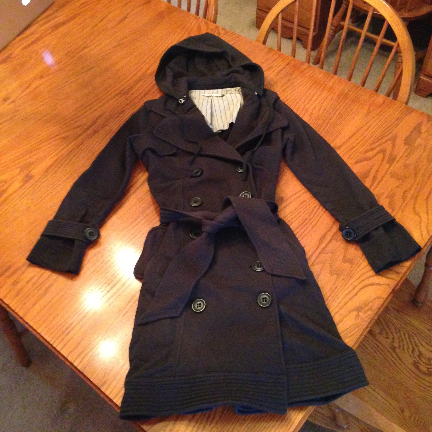 Hi there, I am hoping to put this Mike & Chris coat into the hands of someone who might get to wear it more often than I have (only a handful of times in the last few years). The coat is black, a smaller sized Medium, length hits at about the knee. It is a soft cotton that almost feels like a cozy hoodie, but it can certainly be worn for more formal occasions. There is a hood that is detachable. I have attached a photo below. Asking for $100 OBO. Please e-mail or call my cell phone with any questions or offers. Thanks! Nicole 412-860-8224