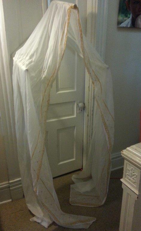 White Bed canopy with gold trim. $15 http://pittsburgh.craigslist.org/fuo/4310315348.html