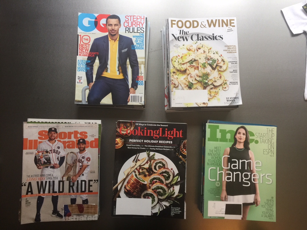 Hi, We have free magazines from the following titles: - Sports Illustrated - Cooking Light - Food & Wine - Inc Business Magazine - GQ Issues are from 2017-2018 and most were never even opened! Would love to pass them along before the end of this weekend. Call or text Josephine 716-901-2631