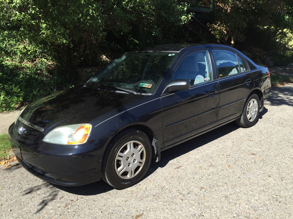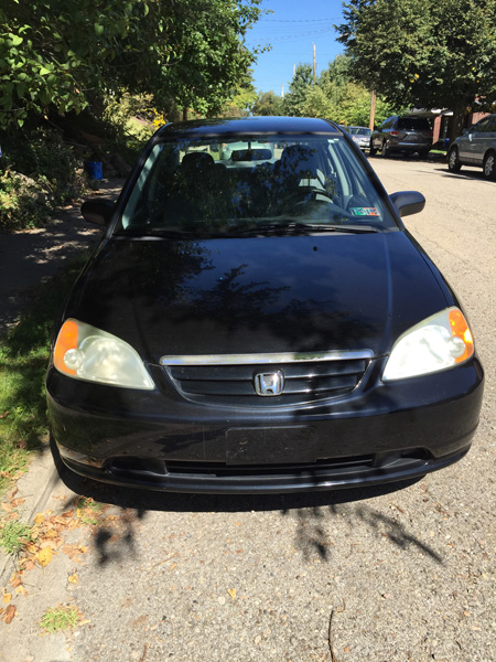 For Sale: 2002 black Honda Civic LX. 85,000 miles. Automatic 4 cycle, FWD, power steering, tilt wheel, CD player, AC, power front windows, power door locks, cruise control, steel wheels, newer tires and battery. Currently inspected until 6/17. Runs well. $2900.