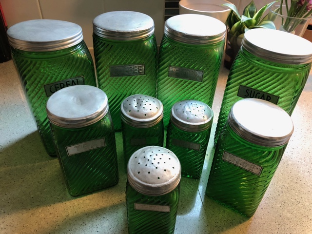$15 - all with the same pattern: 5 coupe glasses, 6 sherry glasses, 2 small wine glasses $40 - green glass canisters sets with lids: Cereal, coffee, flour, sugar, tea, rice, sugar, salt (label damaged) Sent from my iPhone