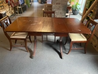 Free this weekend table and three chairs. Please email me or text me for a faster response (412-400-8241) Curb pickup in highland park. Old table with one leaf and sides fold down. The chairs need a little wood glue.