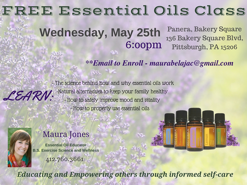 FREE Essential Oils 101 Class. Wednesday, May 25th - 6:00pm Panera, Bakery Square 136 Bakery Square Blvd, Pittsburgh, PA 15206 (see attached flyer on how to enroll) Thanks so much! -- Maura Jones Essential Oil Educator www.mydoterra.com/maurajones Owner at Maura Ellen Photography www.mauraellenphotography.com