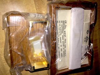 1) Engraveable Oak Desk Set ($5) Brand new, never been used and still in original plastic. Business card and note paper holders. Both made of oak, and each sporting a brass plate intended for personal engraving.
