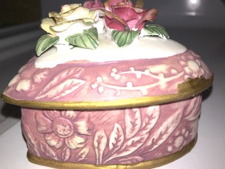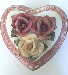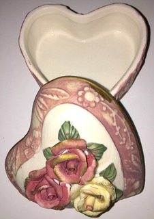 2) Ceramic Keepsake Box ($5) Beautiful, ceramic heart-shaped keepsake box with raised floral detail. Three roses on top have gold brushed petals. Overall size is 3 1/2” x 3 3/4”.