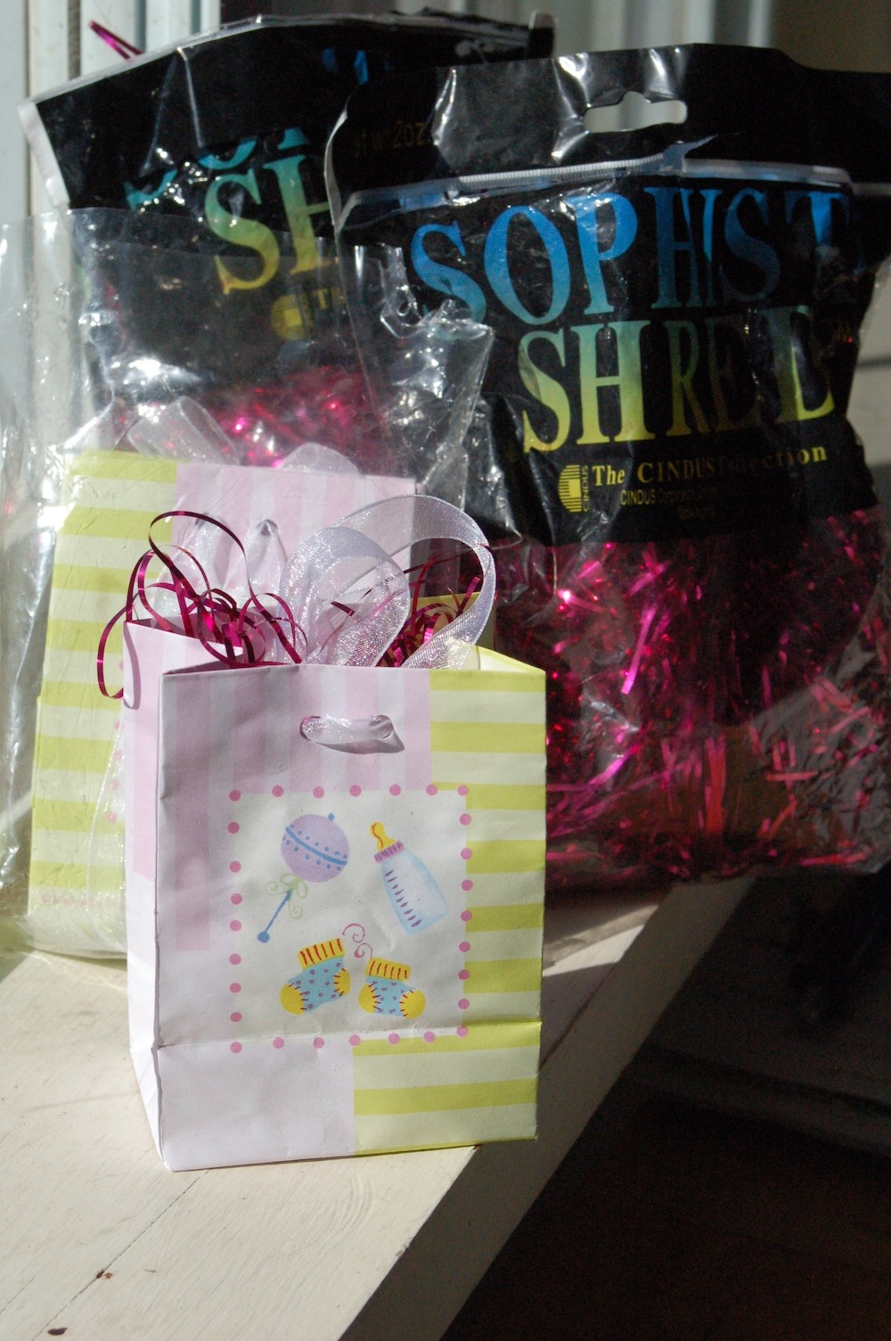 Can anybody use18 little gift bags with baby shower design and pink shredded filler for inside? Picture attached. Let me know and they are yours for the taking!