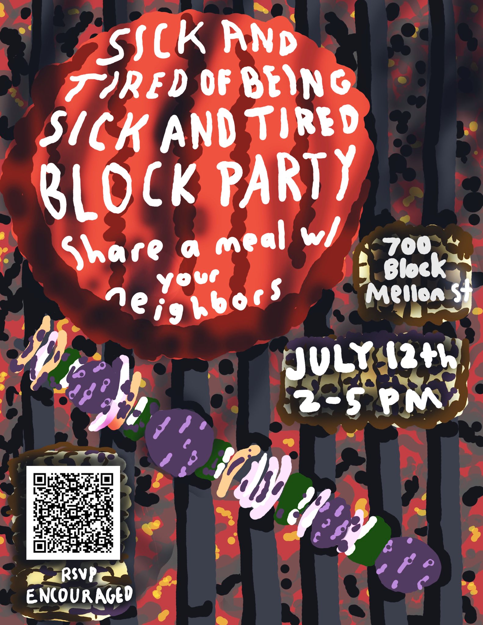 Hello neighbors! The 700 block of Mellon St is holding a block party next weekend, *July 12th, from 2 to 5pm*! That's Mellon St between Hays and Stanton, a block and a half over from where Stanton meets Negley. [image: bloc_party_jul_12.jpg] If you're at all like me, it's been harder to meet with people around you face to face to blab with the people in your community after the past few years. This event is being planned as an opportunity for us to chip away at that isolation, to vent and collaborate around whatever we might be facing as residents around here. *You can RSVP *to help them get an expected headcount for food and the like, either by scanning the QR code on the attached flyer, or by going to the link here: RSVP form <https://docs.google.com/forms/d/e/1FAIpQLSex3bR0G-E-ITKi-V7zwOfSQc9ceMufO8p1eEHL6YMPzzNWqg/viewform?usp=header> . Drop by, bring a neighbor! There will be food!