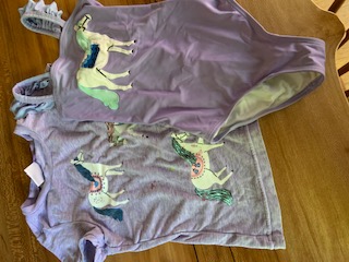 Some paint stains on t-shirt front. Visible on zoom in of picture or I can send closeup. Bathing suit in good condition. Size 120cm or 6-7. $10 for both. Sent from my iPhone