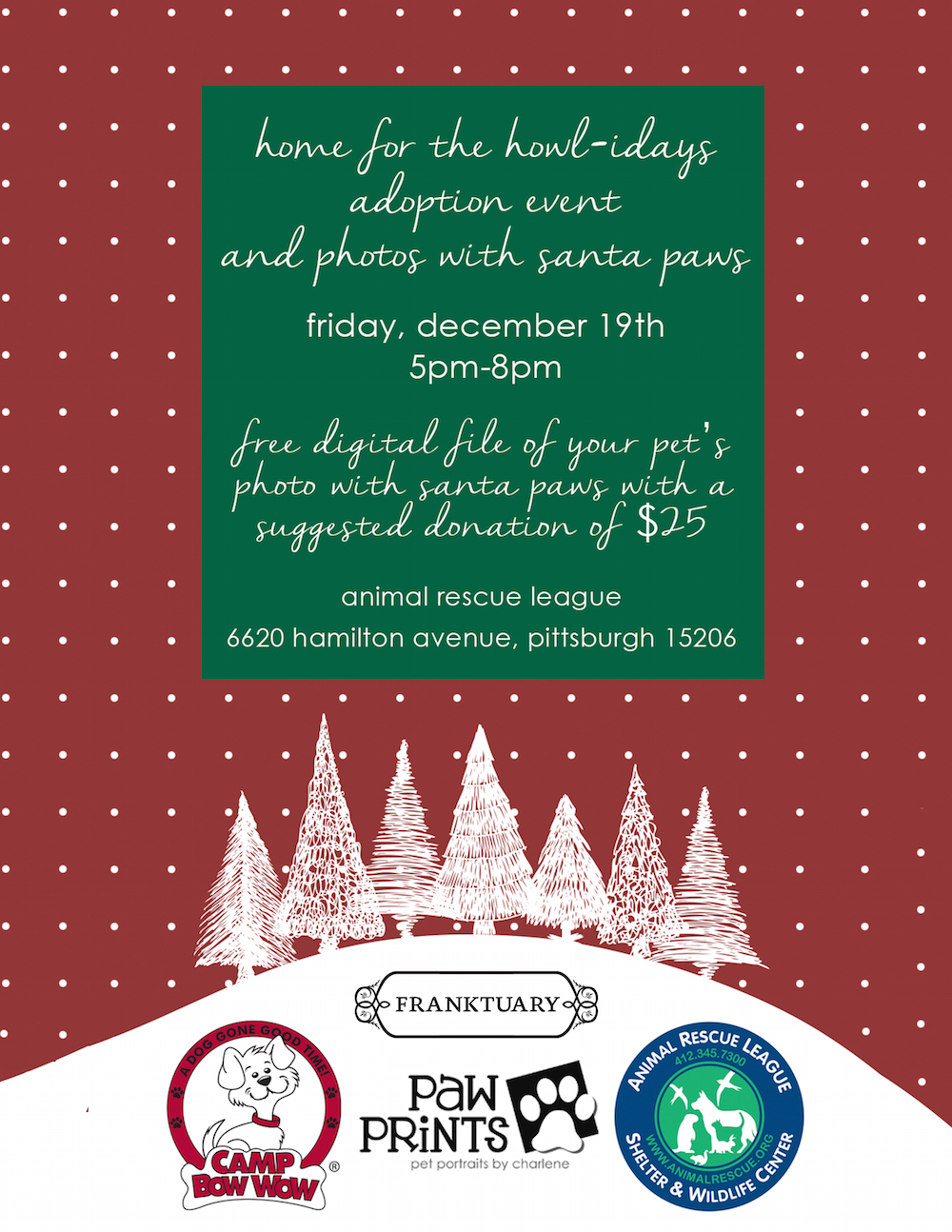 You're invited to Holiday Pet Photos with Santa Paws at the Animal Rescue League this Friday, December 19th, from 5-8pm! There is a suggested donation of $25, which includes a digital print of your pet's special moment with Santa! Franktuary will be attending as well, so come hungry!! Furry Regards, Nicole Zinsser Camp Scout aka Marketing Manager Camp Bow Wow Pittsburgh 412-362-7529 x117 nicole@campbowwowpgh.com www.CampBowWowPgh.com <http://s.wisestamp.com/links?url=https%3A%2F%2Fwww.facebook.com%2Fpages%2FCamp-Bow-Wow-Pittsburgh-Southwest%2F102070922291&sn=bmljb2xlQGNhbXBib3d3b3dwZ2guY29t> Green Tree <https://www.facebook.com/pages/Camp-Bow-Wow-Pittsburgh-Southwest/102070922291?ref=hl> <http://s.wisestamp.com/links?url=https%3A%2F%2Fwww.facebook.com%2Fpages%2FCamp-Bow-Wow-Pittsburgh-North%2F90815563987&sn=bmljb2xlQGNhbXBib3d3b3dwZ2guY29t> North Hills <https://www.facebook.com/pages/Camp-Bow-Wow-Pittsburgh-North/90815563987?ref=hl> <http://s.wisestamp.com/links?url=https%3A%2F%2Fwww.facebook.com%2FCampBowWowHighlandPark&sn=bmljb2xlQGNhbXBib3d3b3dwZ2guY29t> Highland Park <https://www.facebook.com/CampBowWowHighlandPark?ref=hl> _