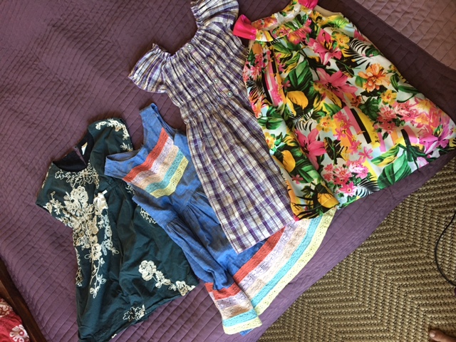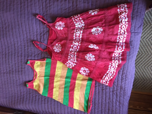 Striped organic cotton + red batic; 3-4T; $8 for both White cotton with light gray flowers; 5T; $4 Lot of four, various colors; size 7; $15 for all I can deliver. Thank you.