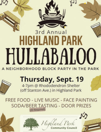 Hello Neighbors! You're invited to the 3rd annual neighborhood Hullabaloo event on *Thursday September 19th, 4-7pm @ Rhododendron Shelter (off Stanton Ave) in Highland Park* There'll be free food, live music, face painting & children's activities, soda and beer tasting (with ID), and door prizes! Come meet and relax with your neighbors as we say goodbye to summer and hello to fall! The musical lineup includes 3 returning favorites: - 4-5 pm Downtempo - West African percussion and other "world music" - 5 - 6 pm Mitch Hal - Appalachian music on his 5-string banjo - 6 - 7 pm Michael Stang - “Fun Facts” will play original tunes and some popular covers. [image: 2024_Hullabaloo_miniGraphic2.png] (Note that this event serves as September's monthly HPCC Public Meeting.) -- Click here to visit our website <https://hpccpgh.org/>