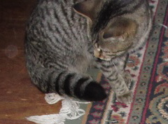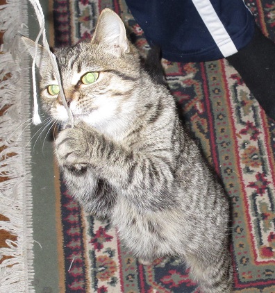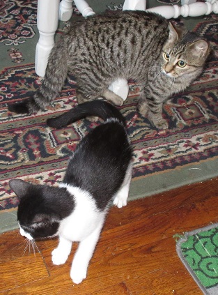 Have you ever wanted a well-mannered, leopard striped, looks like an expensive breed cat? We have a beauty, Ginger, that we are fostering until mid October. She's spade, micro-chipped, and kid-friendly. Did I mention beautiful? Check out that raccoon tail and those black tipped ears! She found her way onto our laps within an hour in our home and has a great personality. At six months old, she's beyond the clawing-everything-in-reach stage, but still very playful and good with other animals since she warmed up to Zing after a few minutes.Zing, at three months, is extra cute and ready for fun. Also kid-friendly, spade, micro-chipped and a snoozer, (when she's not zinging around the room - hard to get a non-blurred photo) she warmed up to Ginger immediately, so if you have other pets at home, she'd likely fit in well. Her fur is super soft making her super cuddly. After just a few moments of petting, she fell asleep on my son's legs. She's ready for some love and also ready for adopting by mid October.Both are available through animal rescue league on Hamilton Ave usually for about a $45 adoption fee. Contact us for details.