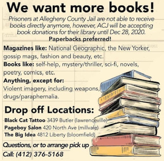 Thank you to everyone that has donated books for us to take to Allegheny County Jail (see the copied text below for more info on this, if needed). At this point, we nearly have enough donated books to fill our entire car, which is wonderful. Even more wonderfully, neighbors have volunteered to fill their cars and help drop off the donations, so we can take even more! *We will continue collecting until December 20th,* so please continue to bring them to our *back porch*. We live at 5901 Hampton St., on the corner of Euclid and Hampton.