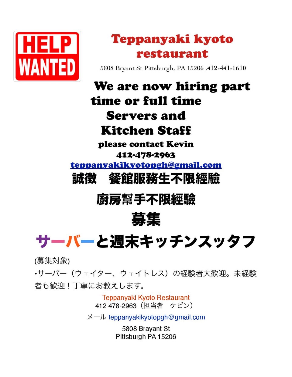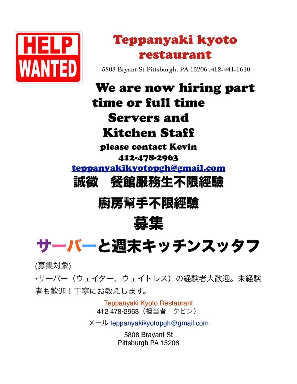 Teppanyaki Kyoto Restaurant (Help wanted)