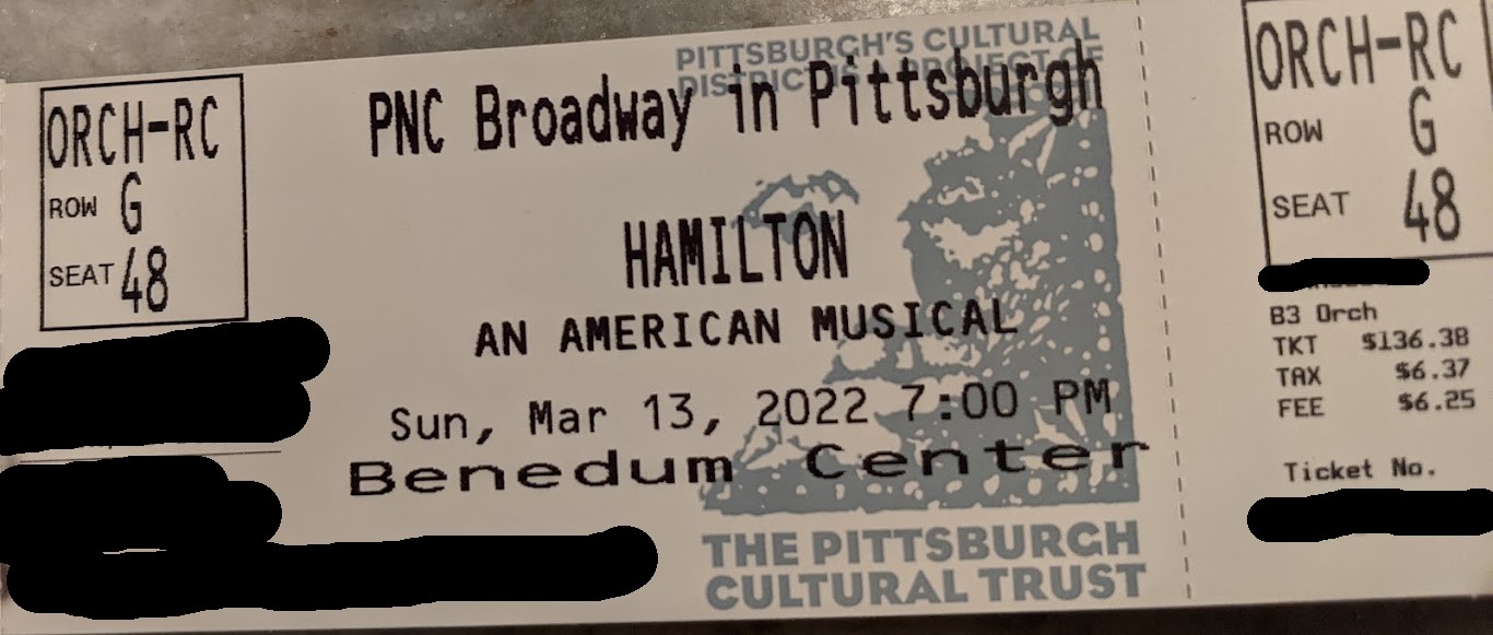 We have 3 extra tickets for the last show of Hamilton Sunday March 13, 7pm. Great seats! Orchestra Right Center, Row G seats 48, 50, 52. I do not want to split the three tickets. Asking $200 each. Thanks!Meganpennstmegan@yahoo.com