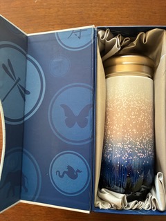 Elegant Teavana Aurora Borealis Gradient Blue and White Porcelain Tea Tumbler; Northern Light design. Includes Strainer. Leak-proof lid. Tourmaline, the semi-precious gemstone, is used to impart a crystal shimmer to the high gloss glaze of this porcelain tea tumbler. Double walled design keeps hands cool while keeping tea warm. New, never used. In original box (the box is beautiful too) $40 There’s a used one on eBay without the strainer and box for $45. Deborah🎃