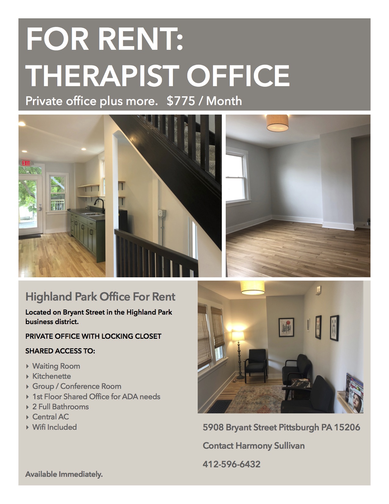 Available Immediately Private office on Bryant Street for a Therapist. 3 Therapists occupy the other 3 office spaces and there is 1 left. Private office with locking closet. Shared use of: Kitchenette Waiting Room Rear deck ADA accessible 1st floor shared office suite - also great for group therapy and/or meetings 2 bathrooms Wifi Central AC Justin Cummings REMAX SELECT 412-418-0596 www.thecummingsbrothers.com 500 closed sales in the last 10 years ===============================