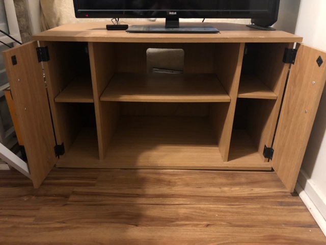 TV Stand/Entertainment Center for SALE! •Measurements:36 inches (width), 20inch (deep) and 21 inch length(tall) •Already put together so no need to assemble. •Coming from a non smoking home. •Contactless Porch Pick Up in Highland Park. $40 OR Best Offer Simply Happy, Marlo