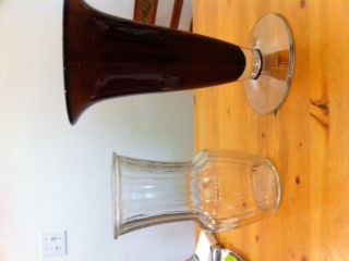 One is dark red and goblet shaped, 11.5 in. The other is clear and fluted, 9.5 in. These will be out on my front porch at 5541 Beverly Pl. if you are interested. Jana