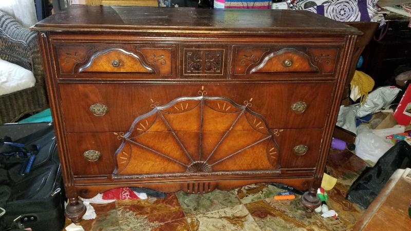 For sale: Circa 1919 bedroom suite with 5 pieces: vanity w/mirror vanity stool dresser w/mirror chifferobe full/queen bed frame Dovetail construction on all drawers. Vanity seat can be easily reupholstered in any fabric. Does need a bit of cleaning up, but no refinishing required. Great for a guest room or a kid's room. $475 or best offer. You haul from our home in Sharpsburg. More photos available upon request. Thanks, Melanie