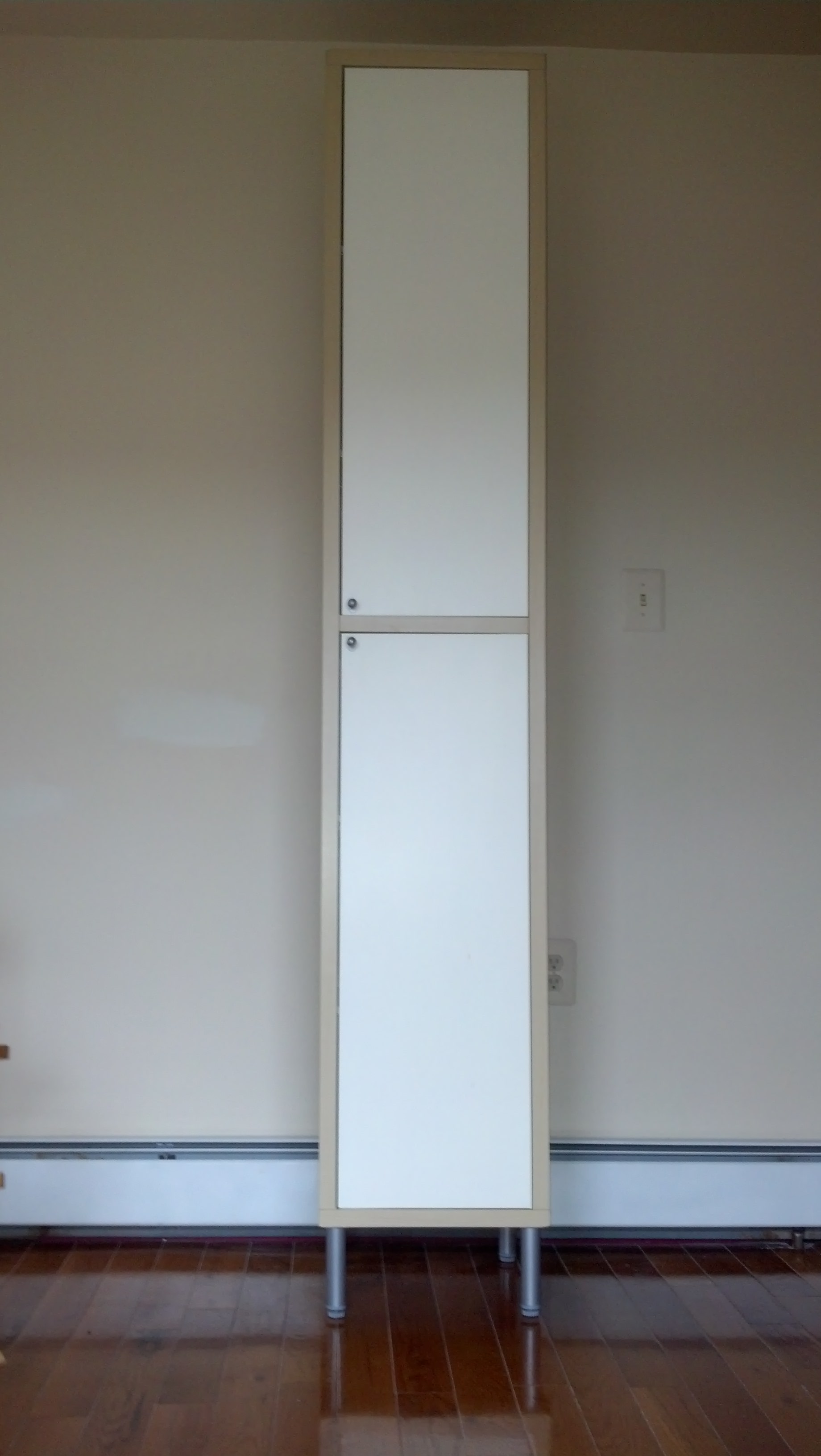 I have a very tall and skinny wardrobe to give away. The sides are are light brown or birch color and the doors are a light cream color. The dimensions are 84" tall x 15" wide x 16" deep.