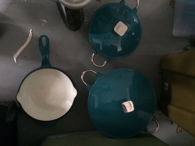 Great quality cast iron heavy cookware. Too heavy to have around my small children, so it sits unused. Smallish skillet Medium casserole/ dutch oven Large casserole/ dutch oven Asking $60 for all 3 pieces Outset brand not le creuset but definitely heavy and well made. Althea M. Bradley