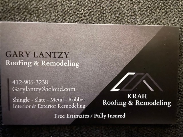 Hello neighbors, We recently put out a request for roofing recommendations. I highly recommend Gary Lantzy KRAH Roofing and Remodeling. Gary has been great to work with. He came out and gave us an estimate as well as repaired the box gutters in a week's time. He was true to his word, efficient, and cleaned up after the work was completed. We have hired him to do another project as well. His card is attached below, here is his # 412-906-3238. Best Regards, Jeni