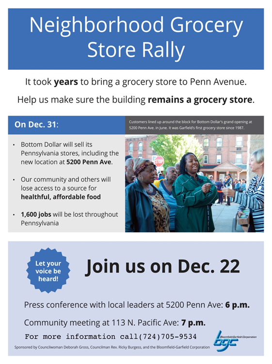 Fight to retain a grocery store in Garfield The 5200 Penn Avenue Bottom Dollar, along with 45 other Bottom Dollar stores in PA are slated to close at the end of the year due to the sale of these stores to ALDI, Inc. ALDI, Inc. has not shared its store by store plan to retain grocery stores in each of the Bottom Dollar locations. Many communities could be left with boarded up facilities and no community access to food. We have also heard that equipment and store fixtures are going to be removed. The Bloomfield-Garfield Corporation and partners are organizing a Neighborhood Grocery Store Rally on December 22nd to support keeping a grocery store at 5200 Penn Avenue. Please sign the online petition (Cut and paste the following) https://docs.google.com/forms/d/1XMMkGzsgr4aUcRXHLURJbr9ky4FFLChoWQCDPpJjImQ... to support keeping a grocery store in our neighborhood and spread the word about the Neighborhood Grocery Store Rally on December 22nd, 6pm, 5200 Penn Avenue! The Bloomfield Garfield Corporation would welcome community leadership that surrounds the 45 stores to join in on the press conference and stay after for joint planning. Attached is copy of the event flyer--- share it out...RSVP.... Lets make something positive happen. Aggie Brose & Wes Davis Bloomfield Garfield Corporation 5149 Penn Avenue Pittsburgh, PA 15224 412-441-6950 [Inline image 1]