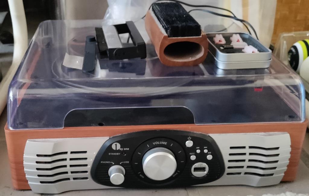 1 by One brand stereo turntable makes turning your records into mp3s a snap. Insert your flash drive into the USB slot, press the record button, play the record, and presto, your record is an mp3! Has red and white RCA outputs. Comes with instruction manual, all documentation, 4 extra styluses, 2 record cleaners, and a stylus cleaner. It is from January 2020. Caution: it is finicky about which flash drive you use. It didn't like my modern high capacity flash drive (recordings skipped) but did a great job with an old 256 MB capacity drive. $30 or best offer. 412-215-9631