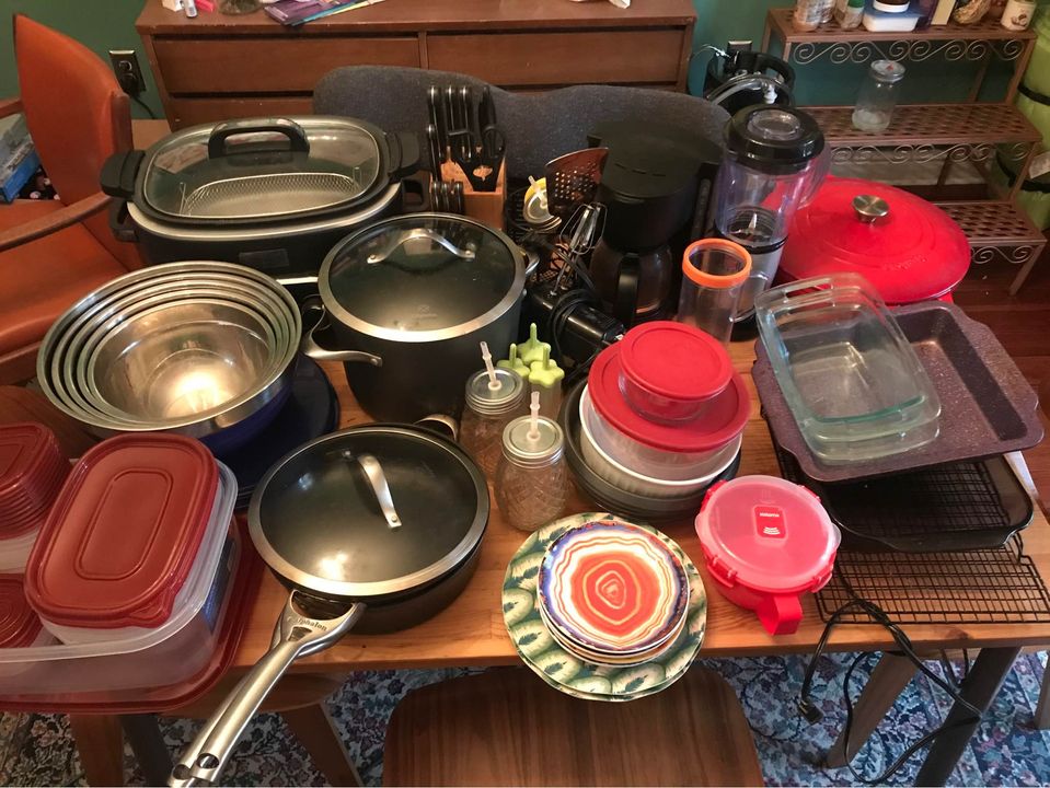 Help me pay for gas to drive across the country! Happy to deliver. 1. Kitchen set - I'm trying really hard to sell this in one go, but reasonable offers to take large amounts of it will be considered. Asking $175 for everything, estimated retail new ~ $450. Everything included listed below. Perfect for stocking an AirBnB or a first apartment. 2. Marin Palisades trail bike - everything works great, I had the tires replaced summer 2019 and have hardly ridden it since (might need some air). It's super fun to take on trails but works great for commuting too. 26" wheels, fits me at 5'4". Bike rack is welded on. Includes frame bag, cable lock, helmet, and an unopened bike light. 3. L-shaped shelves- 1 black, 1 white. Bought for $60 each, asking for $30 each or $50 for the pair. You can stack them together to make a 3x4 or 4x3 rectangle, too. 4. Wood coffee table - sturdy, solid wood, great for storage, asking $60. 5. Rose gold rack - has seen many uses as a plant shelf, shoe rack, and now serves as grocery overflow. It's cute! Asking $15. Kitchen set includes: 1 slow cooker with steamer basket, stovetop, and oven functionality; 6 calphalon cookware pieces- 1 big pot, 1 sauce pan, 1 frying pan, 3 lids; 1 big red ceramic pot; knife block with six steak knives, five cooking knives, scissors, one pokey thing; 5 nested mixing/serving dishes (the smaller ones are perfect for eating one big salad like a misbehaving horse) with matching lids; 34 pieces of a 40-piece tupperware set (no loners); 3 pineapple glasses with lids and straws- perfect for smoothies or tropical cocktails (2 pictured, one in the dishwasher); 5 cup automatic coffee maker with steel mesh basket - no frills, no filter needed!; 1 wrought iron-looking kitchen utensil holder; 1 lemon squeezer ; 1 rose gold spatula; 1 electric beater - a life saver for bakers who can’t afford a kitchenaid tbh; 1 magic bullet blender with big smoothie/personal smoothie cup; Baking dishes: 2 cooling racks, 1 8x11 glass pan, 1 8x8 nonstick pan, 2 4x8 glass loaf pans, 1 8” glass pie dish, 2 nonstick 8” cake pans, 1 deep 7” round ceramic dish; 2 plastic peacock pattern plates; 4 small ceramic geode-pattern dishes; 3 popsicle molds; (Not pictured, oops) 1 holiday-patterned oven mitt, 1 matching pot holder, 1 food scale.
