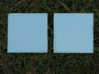 250+ used light blue tiles, 4 3/8" square, plus edge and other pieces. $20.