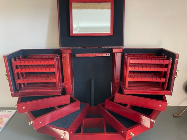 Large, wooden (cherry color) jewelry box for anyone interested. Lots of room and organization options. Recently remodeled our closet with a built in option and cleaned out so no longer need this. Great shape! See photos.