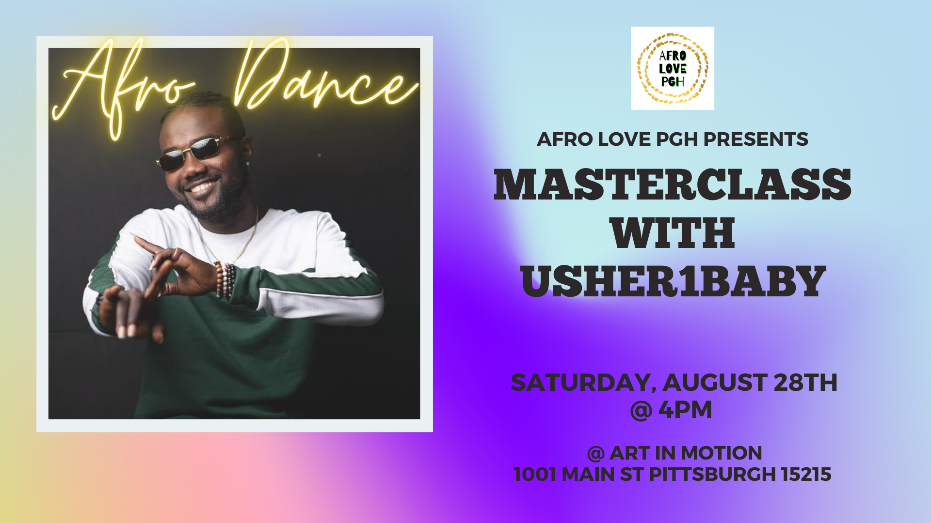 [image: MASTERCLASS W: USHER1BABY.png] *JOIN US FOR A SPECIAL MASTERCLASSwith Usher1Baby!* Saturday, August 28th 4-5:30pm @ Art in Motion Pittsburgh 1001 Main Street, Pittsburgh 15215 This special Masterclass is bringing you one of the best in AfroDance!!! Come learn with us and have fun! We will go over basic steps, technique, energy and history. And if you would like to learn the most current Afro Dance steps, this is the place to be! This Masterclass is for everyone - All levels welcome! *SPACE IS LIMITED* so make sure to register early ;) *COST:* $20 in advance $25 at the door (if space is available!) Please send your payment through Venmo @ Melissa-Jenkins-Yamado + send me an email at AfroLovePgh@gmail.com after payment to receive the workshop details. No Venmo? No problem! Email us for other payment options :) AfroLovePgh@gmail.com HOPE TO SEE YOU THEN! *Much LOVE,Melissa XO*