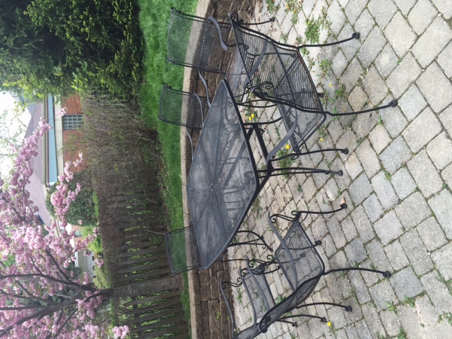 $75: Lovely 7-piece black wrought iron patio set for sale: 6 x 3 ft. table w/ 6 armchairs; umbrella hole in table. Some surface rust that can be sanded/touched up; does not affect functionality. Email if interested, must be picked up this week.