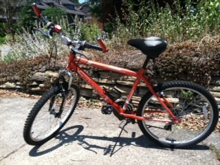 Red. "Magna Great Divide" No idea about tire size. Definitely not a full sized adult bike but just a little bit smaller. I know nothing else about it except that it was my younger sister's and she didn't have room for it in her Mustang when she packed up her car and moved...She is a petite 5'2'' and the tires felt a bit small but she would still ride it around the neighborhood. The brakes need a little love but otherwise seem to be in good condition. The original seat was replaced with a MUCH comfier "Bell Air Gel" seat (pic attached). $30 If interested, please email or call or text 561-703-1744. Thanks, Sylvia