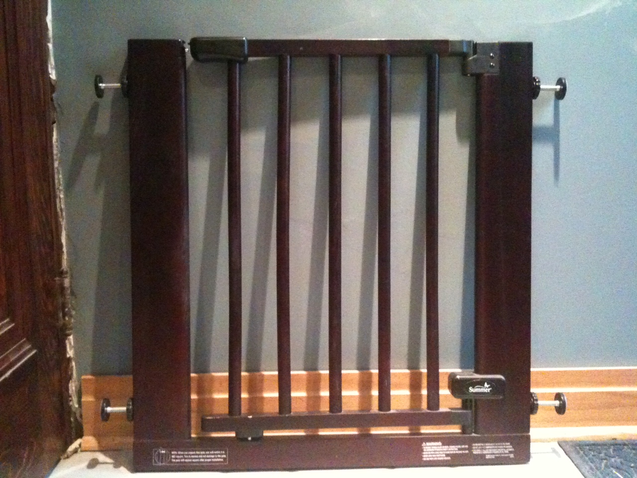 We're reconfiguring our toddler-proofing methods, and subsequently have two spare matching baby gates, great for corralling crawlers, toddlers or pets. Summer Infant "Styles and Secure deluxe wood walk-through gates" -gate is 29 inches tall, and fits openings 29.5 to 40.5 inches wide -pressure mount gate, designed for use in doorways and hallways (not steps) -real wood gate, with a nice dark cherry finish that looks great in highland park homes -Used for about 1 year, so it is gently worn but looks and works great -Includes all spare parts, panels and original boxes -See picture (attached) or specifications on amazon for more details: http://www.amazon.com/Summer-Infant-Deluxe-Walk-Thru-Cherry/dp/B000YZHYLO $40 for both gates, or $25 for one gate. Please email mriecks@gmail.com if interested or need more info. Thanks! -- ------------------------------------------------- Martha Riecks - mriecks@gmail.com