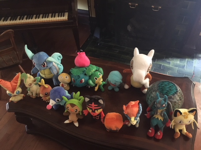 My son is looking to sell some of his Pokémon Plush. They are in good shape, tags cut off. From left to right they are: Victini leafeon Wartortle Torchick Scraggy Poplio Chespin Ivysaur LITTEN Pansage Wabafet Rotom Keldeo Cubone Lucario Meowth Non-smoking household, with cats and a dog. I have run them through the washer already but can do so again for anyone concerned about allergies.