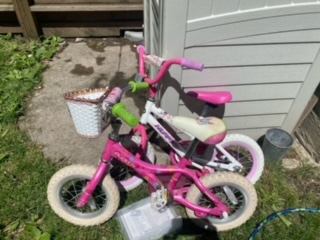 White huffy sea star toddler bike with training wheels- $10 Brand new mail holder- $8 Brand new nostalgia bacon express- $25 Melissa and Doug woodland fairy puzzle-$5 Two New Staples Sign Holders, 8.5" x 11", Clear Plastic (16654-CC)- $2 each Oeuf jumpsuit (never worn) -5t, $25 City bonfires - new - portable fire pit and two marshmallow skewers, handmade with nontoxic materials in Maryland by 2 Dads whose jobs were impacted by the pandemic. - $10 Single city mini-m baby jogger w snack tray- used- it was our airline/travel stroller $10 Diaper change pad $5 Kimberly