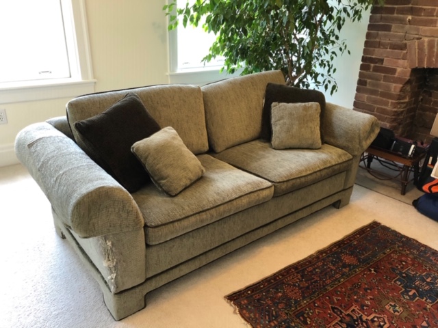 For your consideration: Nice, clean, very serviceable Sterns and Foster Sofa with hide a FULL size bed. The bed is comfortable— even more so with a topper. (Not provided) Full disclosure right corners have been scratched but could be easily be patched with the identical pillow fabric— Great for college apartment or starting up— The best part! FREE! Easy to transport simply by unbolting the inner bed frame—then move in two pieces. Thank you! Sent from my iPhone