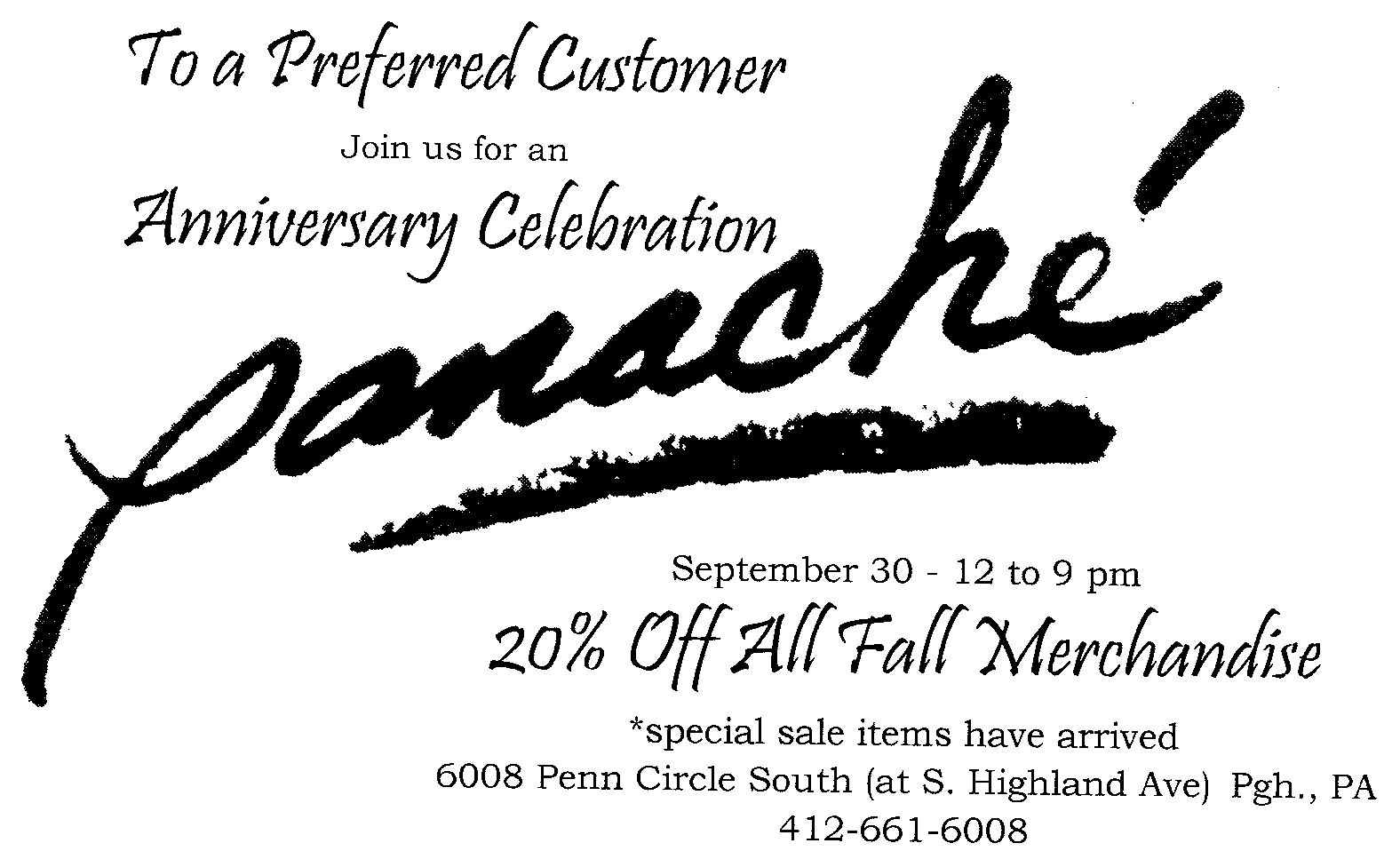 IN CASE YOU AREN'T ON OUR MAILING LIST- STOP BY FOR THE 24TH. ANNIVERSARY SALE AT PANACHE-SUNDAY (BEFORE THE GAME !!!)OR ANY DAY NEXT WEEK FOR SOME FABULOUS NEW FALL FASHIONS! Date: Wed, 26 Sep 2007 18:56:54 -0400From: panachepgh@verizon.netSubject: invitationTo: panachepgh@hotmail.com _________________________________________________________________ Connect to the next generation of MSN Messenger http://imagine-msn.com/messenger/launch80/default.aspx?locale=en-us&source=wlmailtagline