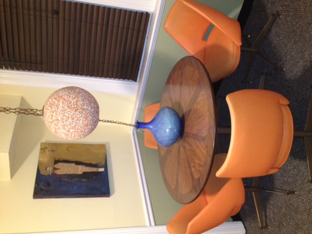 Table and four orange swivel chairs 40" diameter table Great condition for age $345.00 OBO Vintage Orange and White Fiberglass Pendant 12" diameter Needs rewired $95.00 OBO